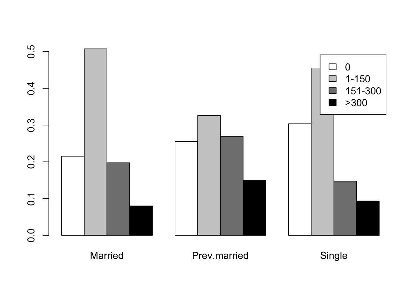 colnames(caff.marital) <- c("0","1-150","151-300",">300")